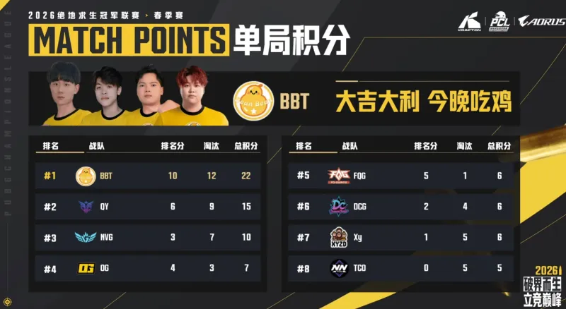 阶段7,FQG被TCO淘汰,TCO两人被BBT满编淘汰,BBT满编打掉DCG独狼,完成吃鸡。