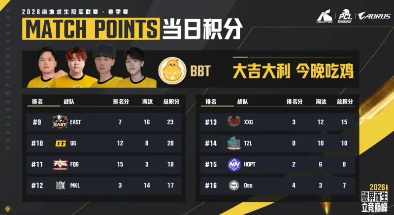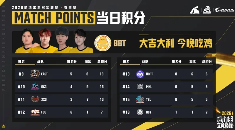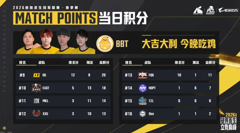 决赛圈,BBT4人满编,OG剩余2人,EAST剩余1人,BBT率先淘汰EAST独狼,而由于梅花桩位于防空洞外,最终BBT选择不进攻防空洞内部,OG两人因为时间来不及打药,最终被蓝圈淘汰,BBT完成吃鸡。
