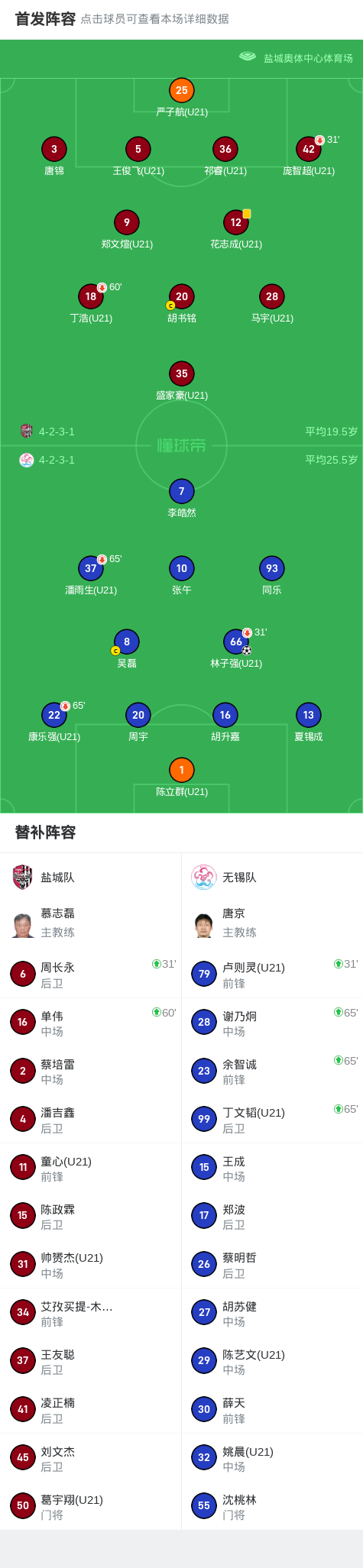 北京时间8月30日,江苏省城市足球联赛第10轮,盐城队主场对阵无锡队。比赛中,林子强头球破门,余智诚补时阶段脚后跟破门锁定胜局。最终比分,盐城队0-2无锡队。