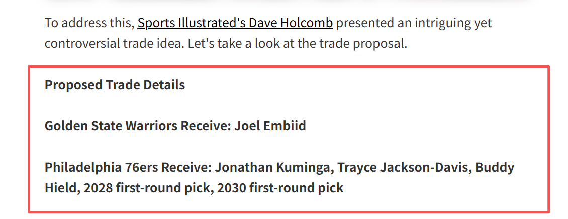 不过,近期《体育画报》的戴夫·霍尔科姆提出了一组颇为靠谱的交易方案,或许能为勇士带来新的希望,在湾区引发了巨大的讨论。那就是将库明加送到 76 人队,换来恩比德,并且这笔交易涉及4个球队。具体的潜在交易方案为:勇士得到恩比德;76 人得到库明加、年轻内线杰克逊戴维斯、希尔德以及 2028 年首轮签和 2030 年首轮签,其中库明加执行先签后换,薪资至少要在均薪 3000 万以上。
