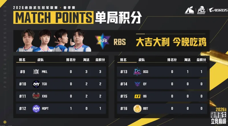 最终阶段,RBS依靠地形优势打掉XY1换2打掉2人,最终决赛圈2V1依靠人数优势完成吃鸡。